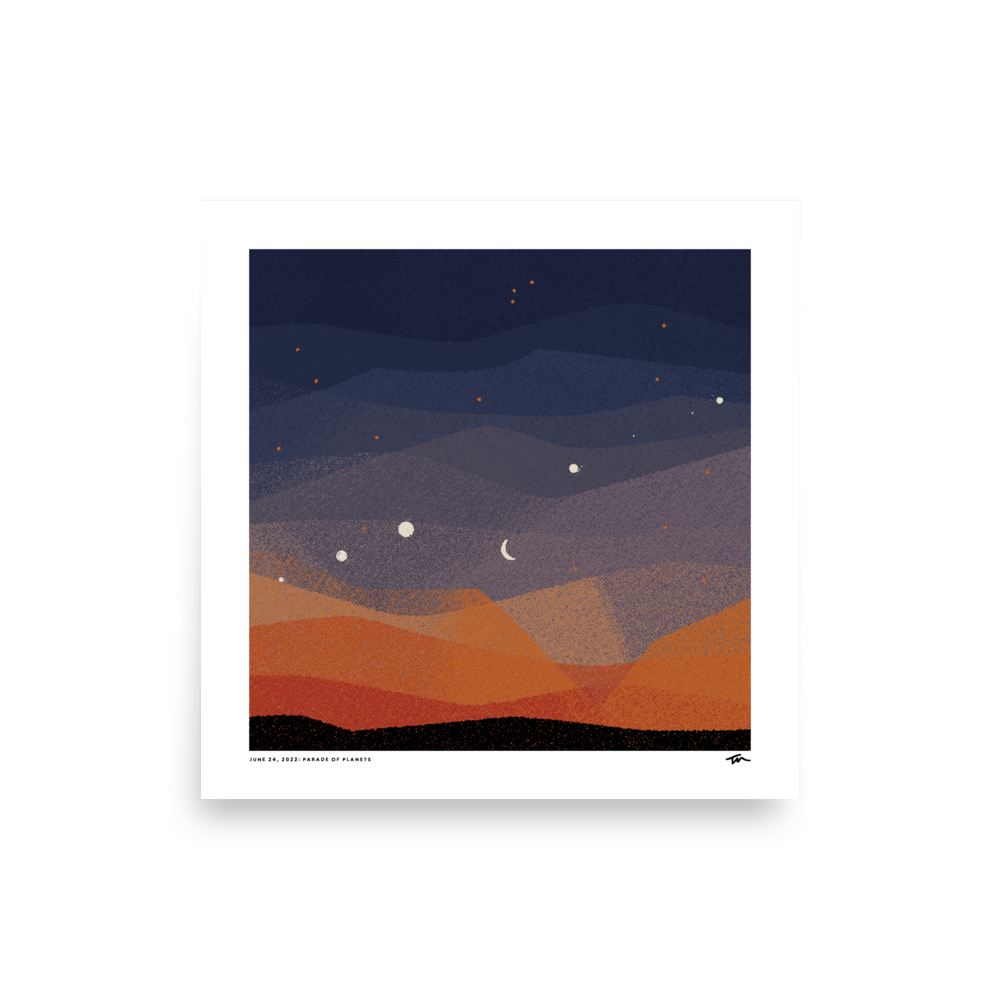 Open edition art print of the design created to capture the beauty of seeing five planets aligned across the sky.